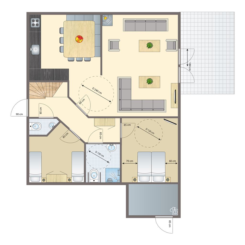 - Aufgrund der max. Türbreite von 75 cm ist dieses Ferienhaus nur für kleine Rollstühle zugänglich