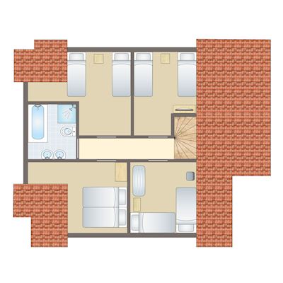 - Drei Schlafzimmer mit jeweils zwei Boxspring-Einzelbetten auf der ersten Etage