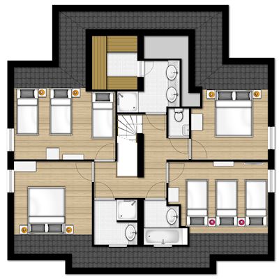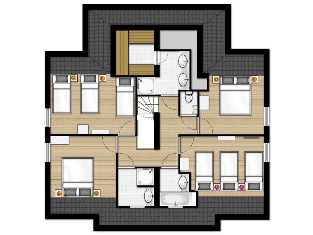 - Zwei Schlafzimmer mit jeweils drei Boxspring-Einzelbetten