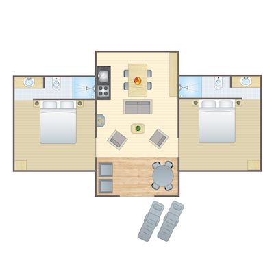 - Zwei Badezimmer (vom Schlafzimmer begehbar) mit Dusche und WC