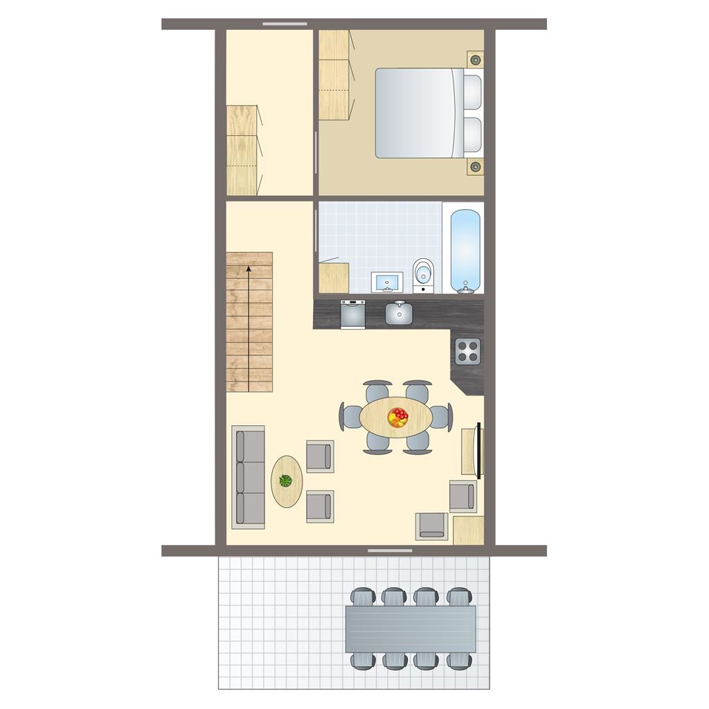 Diese Art von Ferienhäusern ist mit unterschiedlichen Inneneinrichtungen und Fußböden ausgestattet. Die gemütliche Einrichtung variiert daher von Haus zu Haus. Das Ferienhaus verfügt über eine offene Südterrasse, auf der Sie die freie Natur genießen. Das Ferienhaus erstreckt sich über zwei Etagen und verfügt über drei Schlafzimmer. Das kombinierte Wohnzimmer und die Küche bieten einen schönen Rahmen für Familientreffen. Die Ferienhäuser sind in Privatbesitz, daher sind die Beschreibungen, Bilder, Spezifikationen und Grundrisse der Ferienhäuser indikativ und können variieren.