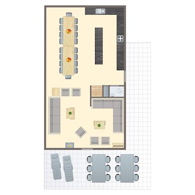 - Die Wohnzimmerunterkunft ist als großes Wohnzimmer für 18 Personen und großer Essküche eingerichtet