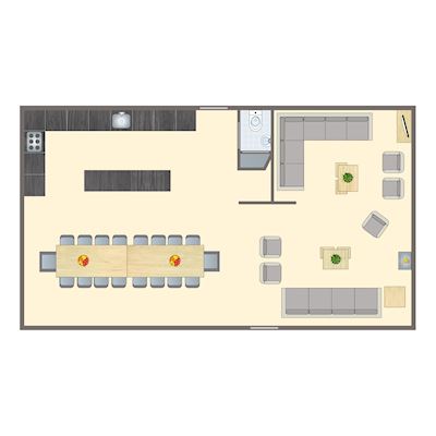 - Die Wohnzimmerunterkunft ist als großes Wohnzimmer für 16 Personen und großer Essküche eingerichtet