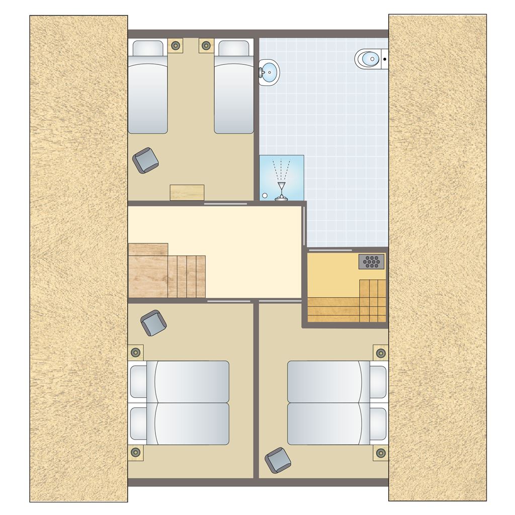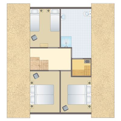 - Drei Schlafzimmer mit jeweils zwei Boxspring-Einzelbetten auf der ersten Etage