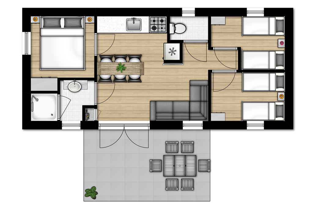- Drei Schlafzimmer mit jeweils zwei Einzelbetten