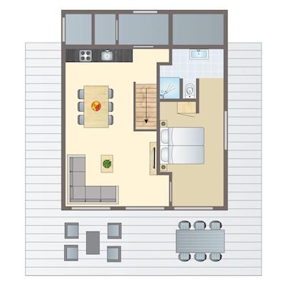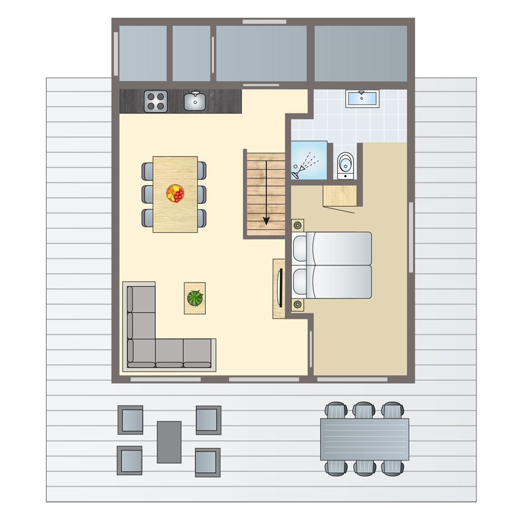 - Badezimmer mit Dusche oder Badewanne (als Sonderwunsch buchbar) und WC auf der ersten Etage