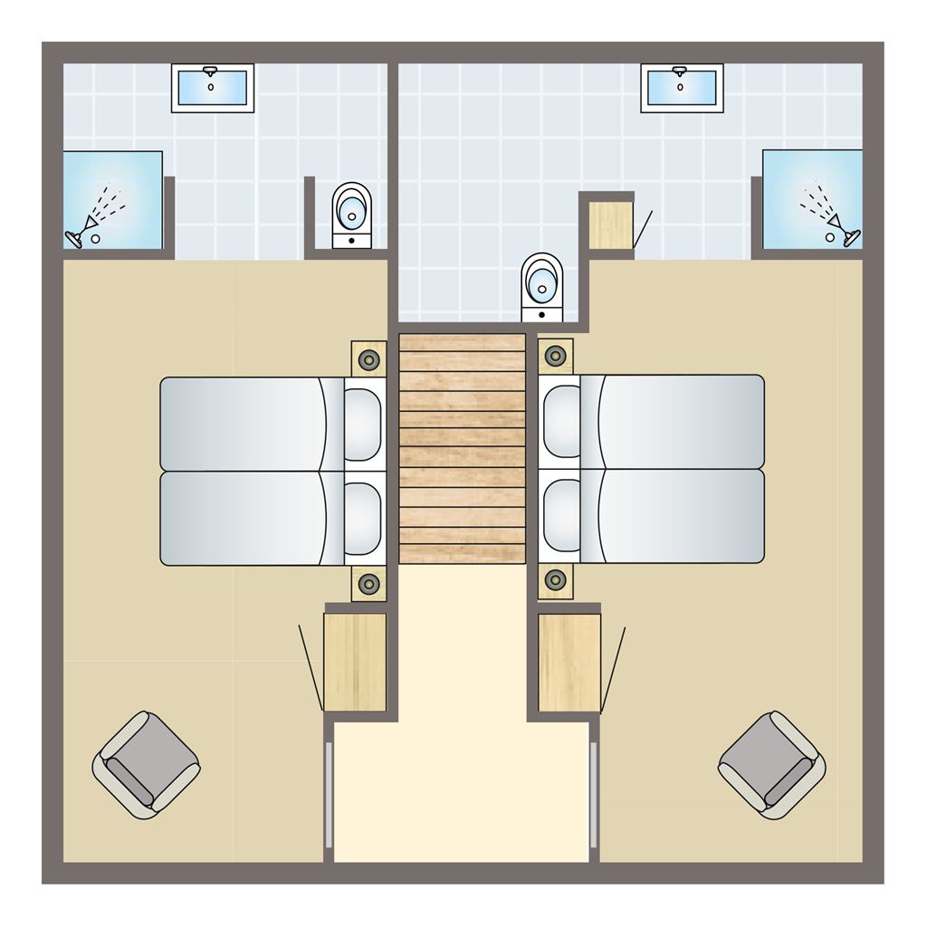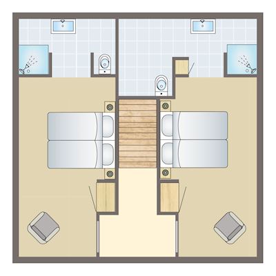 - Zwei Schlafzimmer mit jeweils zwei Boxspring-Einzelbetten auf der ersten Etage