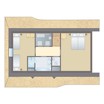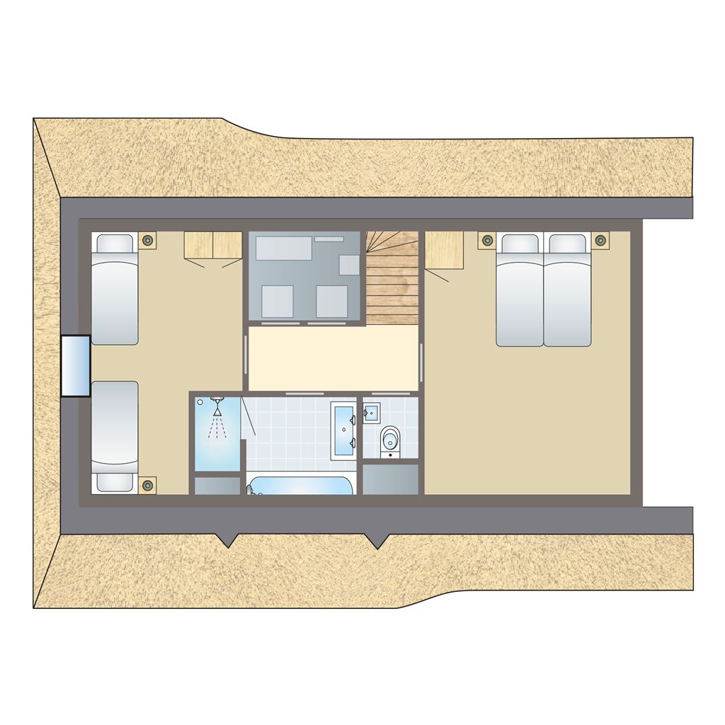- Zwei Schlafzimmer mit jeweils zwei Boxspring-Einzelbetten auf der ersten Etage