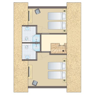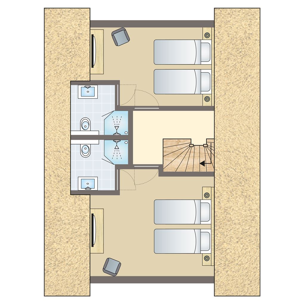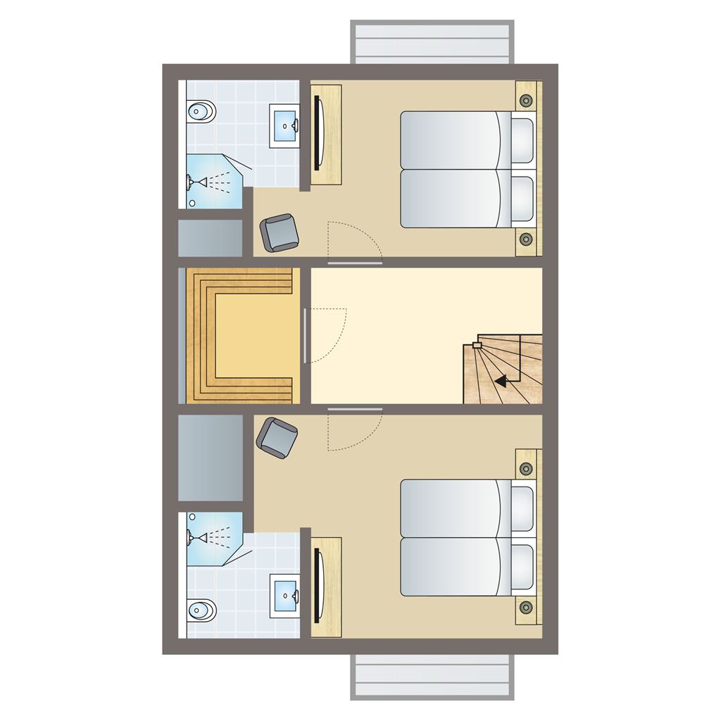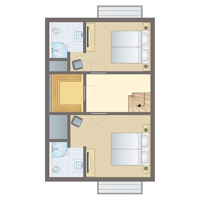 - Zwei Badezimmer (vom Schlafzimmer begehbar) mit jeweils ebenerdiger Dusche und WC auf der ersten Etage