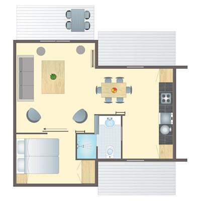 Großes Wohnzimmer und Küche mit Essecke für sechs Personen, Sofalandschaft und Flachbildfernseher. Das Ferienhaus hat eine Holzterrasse auf der Rückseite des Hauses und eine "Morgenterrasse" vor dem Haus. Von dort hat man Aussicht auf den Fjord und Livø, den Kanal oder den See. Schönes Bad mit Fußbodenheizung, Dusche, Toilette und Waschbecken. Ein mit einer Schiebetür abgetrenntes Schlafzimmer mit 3/4-Bett und zwei großen Dachböden (je ca. 5 m2) mit je zwei Matratzen. Die Ferienhäuser befinden sich in Privatbesitz, daher sind Beschreibungen, Bilder, Spezifikationen und Grundrisse der Ferienhäuser unverbindlich und können abweichen.