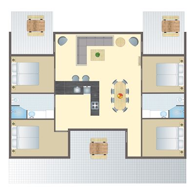 - Vier Schlafzimmer mit jeweils einem Doppelbett oder zwei Einzelbetten