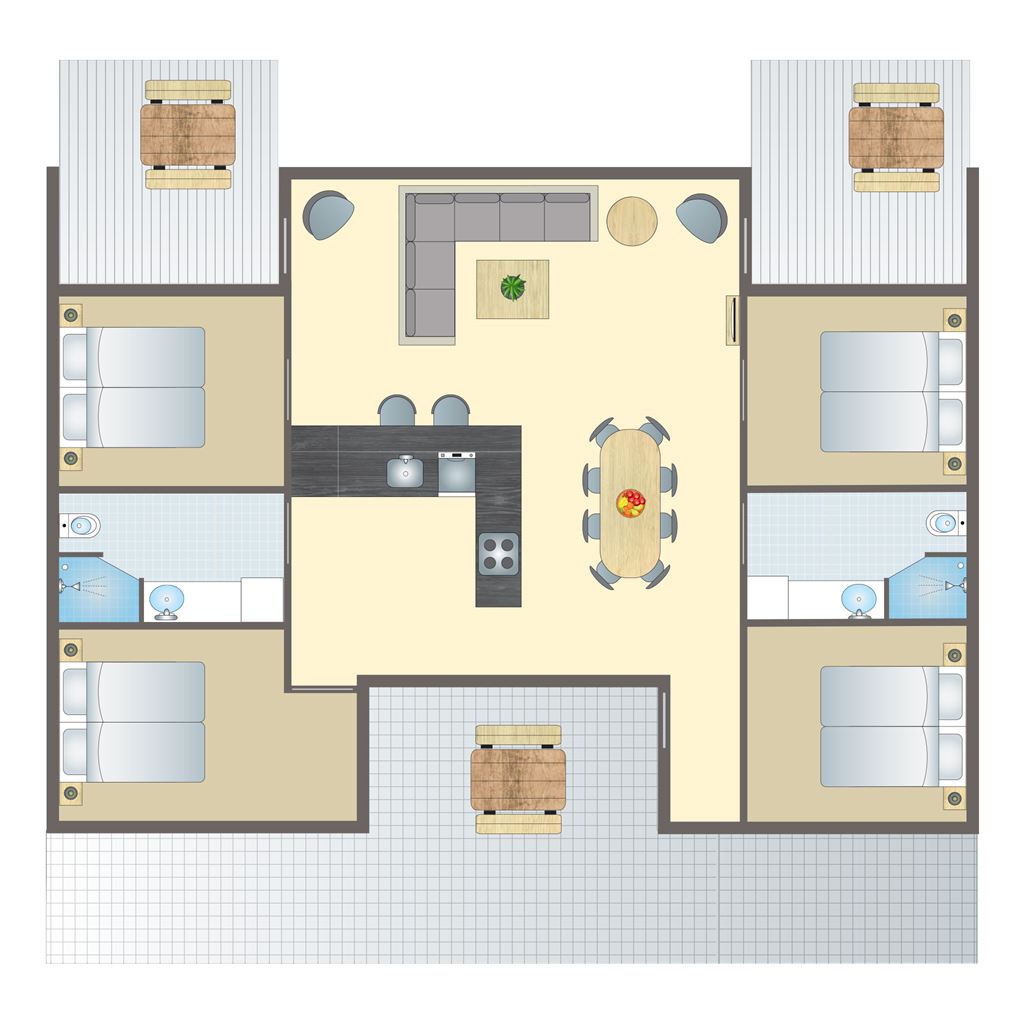 Geräumiges und komfortables Ferienhaus mit schönen Möbeln, in dem man auch dann noch zusammen sein kann, wenn die einen kochen und die anderen es sich auf dem Sofa gemütlich machen, da das Wohnzimmer in offener Verbindung mit der Küche steht. Es gibt drei schöne Terrassen, die teilweise überdacht sind. Die Terrassen sind mit hochwertigen Gartenmöbeln ausgestattet, sodass man es sich gemeinsam gemütlich machen kann. Es gibt vier Schlafzimmer mit je zwei Betten. Die Ferienhäuser sind in Privatbesitz, daher sind die Beschreibungen, Fotos, Spezifikationen und Grundrisse der Ferienhäuser indikativ und können variieren.