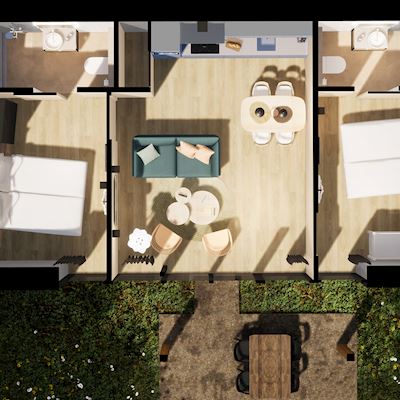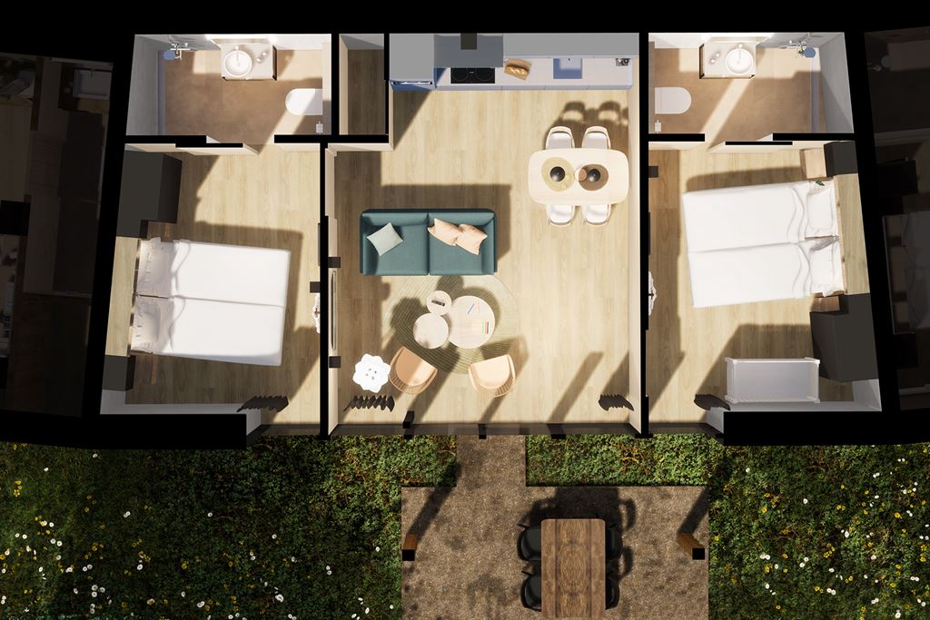 - Zwei Schlafzimmer mit jeweils zwei Boxspring-Einzelbetten