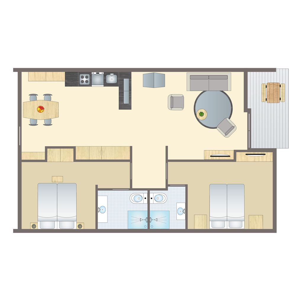 - Zwei Schlafzimmer mit jeweils einem Doppelbett