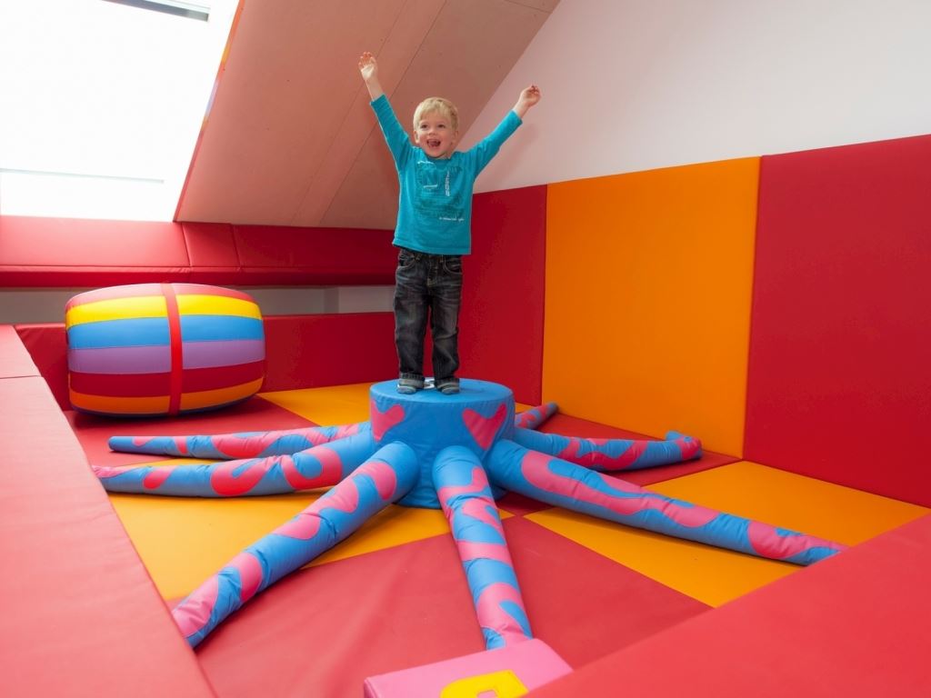 Auch bei schlechtem Wetter bietet der Indoor-Spielplatz jede Menge Action. Die Kleinsten klettern und bauen einen Turm aus großen Bauklötzen, während die Größeren ihren Spaß an den Spielautomaten haben.