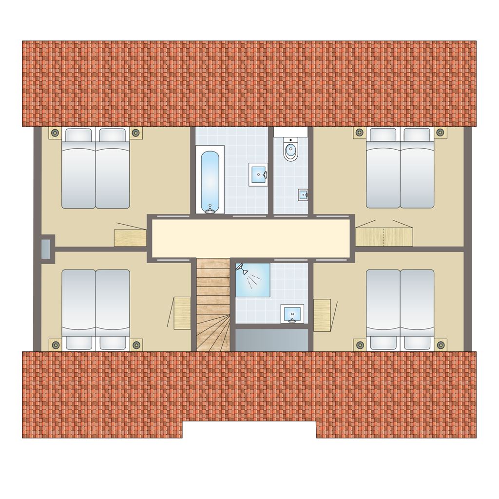 - Drei Schlafzimmer mit jeweils zwei Boxspring-Einzelbetten auf der ersten Etage
